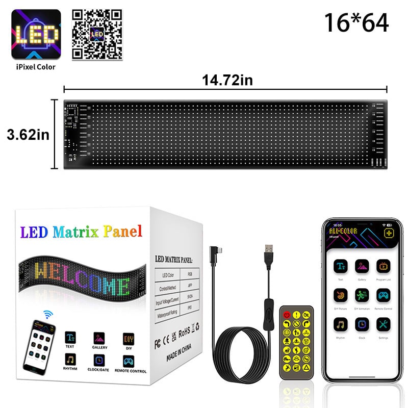 Multiple programmable modes: scrolling (left/right/up/down), snowflakes, lasers, static, or rotating fonts (90°â270°). Stands out day and night.
